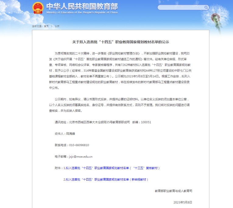 2023年5月8日教育部职业教育与成人教育司公示了拟入选首批“十四五”职业教育国家规划教材名单。我校教师包科杰主编的《新能源汽车维护与故障诊断(第2版)》、吕爱华主编的《电气控制与PLC应用技术(三菱系列)(第4版)》和《电工基础与技能》、李兆平主编的《电动汽车动力电池及能量管理》、杨关全主编的《冷冲压工艺与模具设计(第五版)》五本教材通过国家复核立项十四五职业教育规划教材。